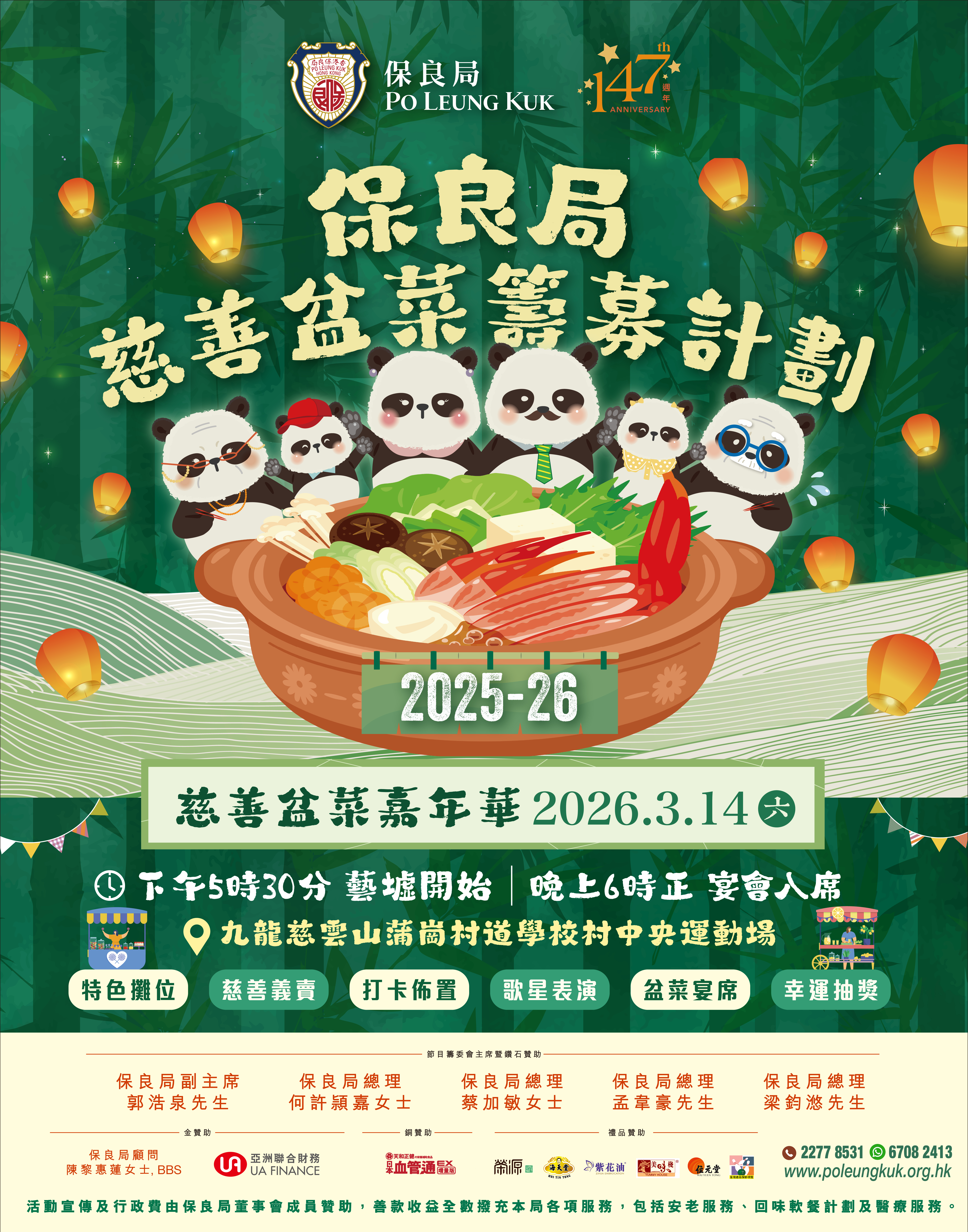 保良局慈善盆菜籌募計劃 2025-26 現已展開,歡迎善長參加盆菜嘉年華和捐款獲贈慈善盆菜券,共襄善舉。是次活動宣傳及行政費由保良局董事會成員贊助,善款收益全數撥充本局各項服務,包括安老服務、回味軟餐計劃及醫療服務。